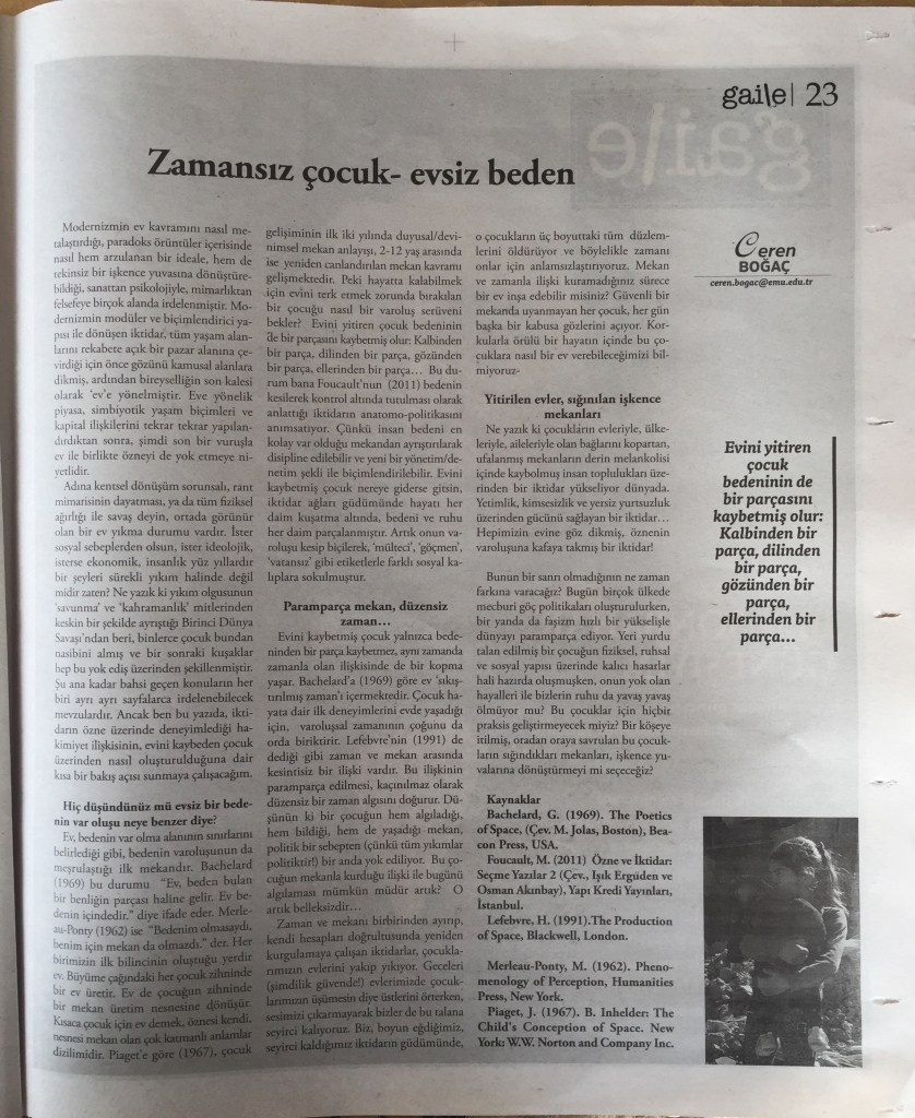 Ev, bedenin var olma alanının sınırlarını belirlediği gibi, bedenin varoluşunun da meşrulaştığı ilk mekandır. Bachelard (1969) bu durumu “Ev, beden bulan bir benliğin parçası haline gelir. Ev bedenin içindedir.” diye ifade eder. Merleau-Ponty (1962) ise “Bedenim olmasaydı, benim için mekan da olmazdı.” der. Her birimizin ilk bilincinin oluştuğu yerdir ev. Büyüme çağındaki her çocuk zihninde bir ev üretir. Ev de çocuğun zihninde bir mekan üretim nesnesine dönüşür. Kısaca çocuk için ev demek, öznesi kendi, nesnesi mekan olan çok katmanlı anlamlar dizilimidir. Piaget’e göre (1967), çocuk gelişiminin ilk iki yılında duyusal/devinimsel mekan anlayışı, 2-12 yaş arasında ise yeniden canlandırılan mekan kavramı gelişmektedir. Peki hayatta kalabilmek için evini terk etmek zorunda bırakılan bir çocuğu nasıl bir varoluş serüveni bekler?