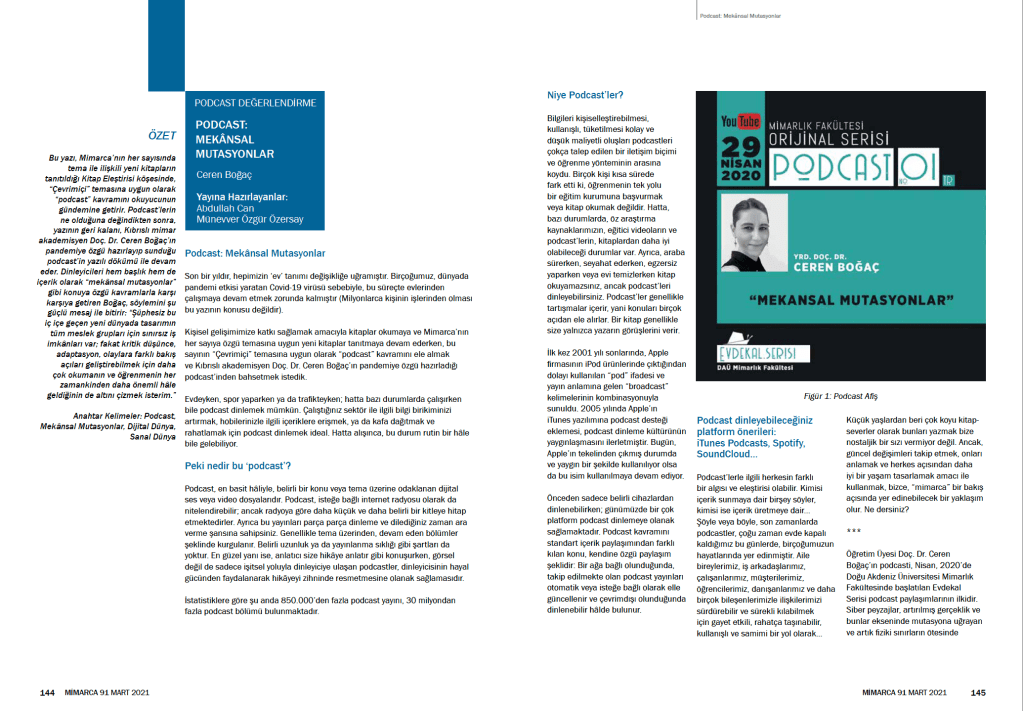 Bu yazı, Mimarca’nın her sayısında tema ile ilişkili yeni kitapların tanıtıldığı Kitap Eleştirisi köşesinde, “Çevrimiçi” temasına uygun olarak “podcast” kavramını okuyucunun gündemine getirir. Podcast’lerin ne olduğuna değindikten sonra, yazının geri kalanı, Kıbrıslı mimar akademisyen Doç. Dr. Ceren Boğaç’ın pandemiye özgü hazırlayıp sunduğu podcast’in yazılı dökümü ile devam eder. Dinleyicileri hem başlık hem de içerik olarak “mekansal mutasyonlar” gibi konuya özgü kavramlarla karşı karşıya getiren Boğaç, söylemini şu güçlü mesaj ile bitirir: