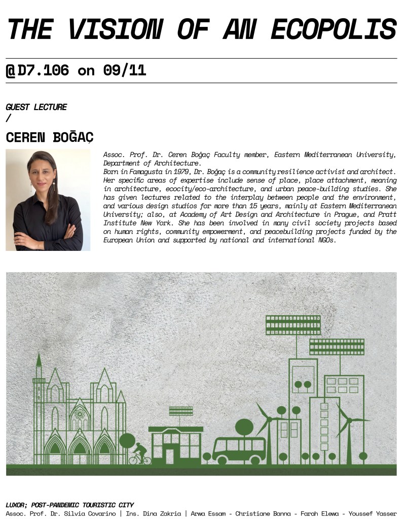 I would like to thank Dr. Covarino for inviting me to share my insights on ecocity and find a chance to negotiate the ecological and sustainability dimensions of tourist cities. Two amazing studios in parallel coordinated by Dr. Silvia Covarino in Egypt and Dr. Hassina Nafa in Cyprus are also challenging post-pandemic tourism potentials and new visions.