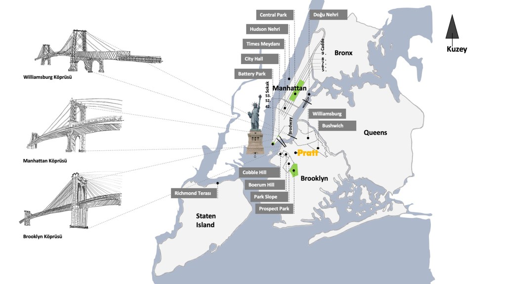 Pratt Enstitüsü Mimarlık Bölümü’nde öğleden akşama uzayan tasarım stüdyosunda ders vermediğim, seminerlerimin erken bittiği ve ayazın yerini kenti sarmalayan bir bahara bıraktığı günlerde, Manhattan döngümü ihtişamla yükselen gotik kuleleriyle Doğu Nehri’nin iki yakasını birbirine bağlayan Brooklyn Köprüsü’nden geçen uzun bir yürüyüşle başlatıyorum. Bu köprünün çalışmalarına yaklaşık 150 yıl önce, nehir buzla kaplanıp teknelerle Brooklyn’den Manhattan’a varmak imkansızlaşınca başlanmış. New York her metropol gibi şehir efsanelerinin katlanarak çoğaldığı bir yer ve üzerinden günlük yüz binlerce araç ile on binlerce yayanın geçtiği bu köprünün de hüzünlü bir hikayesi var: Hayal ettiği bu yapıyı hayata geçirmek için konum tespit çalışması sırasında feribotun yaraladığı bacağının tetanos kapması sonucu hayatını kaybeden halat üreticisi mühendis John A. Roebling, babasının yerine geçen fakat köprü altı ayaklarının yapımı sırasında vurgun yiyip felç olan Washington Roebling ve yatağa mahkum kalan eşinin bu inşaatı sonlandırabilmesi için verdiği mücadeleyle fahri olarak yapıyı tamamlatan Emily Warren Roebling. [16] Brooklyn’in kadın izi taşıyan ve son zamanlarda araç trafiğine kapatılarak sadece yaya ve bisiklet geçişine izin verilmesi planlanan zarif köprüsü, dünyanın en şairane, kesintisiz ve kentteki herkese ait alternatif mevki olarak insana coşku veriyor. Bu şehirdeki böylesi muhteşem yapıların varlık anları, Lacan’ın aynası gibi kendi benliğinizi daha net görmenize yardımcı oluyor. [17]