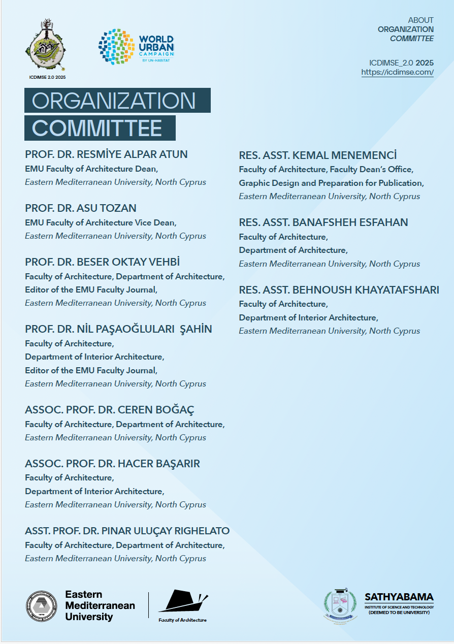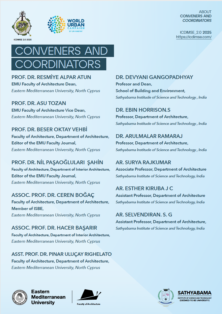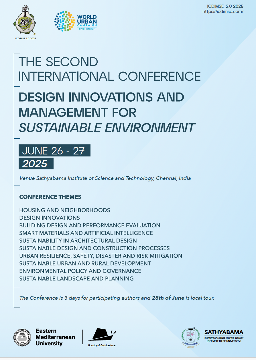 The 2nd International Conference on Design Innovations and Management for Sustainable Environment (ICDIMSE_2.0 2025) is set to bring together a diverse group of academicians, scientists, practitioners, researchers, and scholars to foster the exchange of ideas and share scientific and practical insights on various aspects of sustainable design of the built environment. ICDIMSE_2.0 aims to enhance awareness and drive progress toward the Sustainable Development Goals (SDGs). The conference aims to provide an interdisciplinary platform to discuss the most recent innovations, trends, concerns, practical encounters in building and environmental design and raise awareness concerning state-of-the-art strategies adopted in the fields of Sustainable Design of Built Environment. The ICDMSE_2.0 2025 will include the new themes of Housing and Neighborhoods, Sustainable Landscape and Planning. The conference will include prominent keynote speakers to promote the exchange of knowledge on the given conference themes, ranging from Building Design Innovations to Environmental Policy Making and Urban Resilience to Landscape and Housing. The conference aims to contribute to knowledge and practice on Design Innovations and Management for Sustainable Environments. The organizing institutions – Sathyabama Institute of Science and Technology and Eastern Mediterranean University collaborate with other partner institutions aiming to achieve a robust international network.
