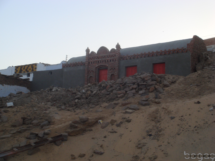 The picture on the right: The typical Nubian houses are either in bright blue, deep red or mustered yellow. These colors gives a unique identity to the region. The houses are typically one story, made of mud-brick, has no flooring.The houses are also decorated with crocodile skulls or wall paintings of Mecca pilgrims.