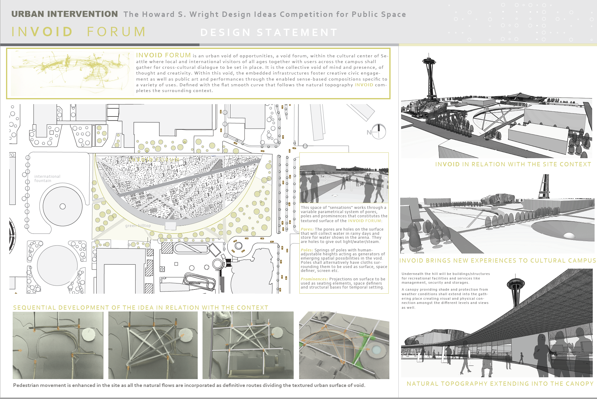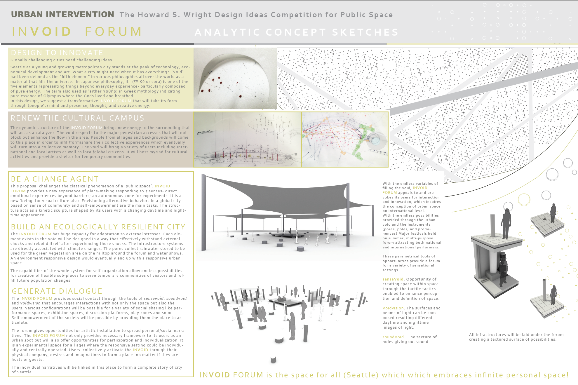 INVOID FORUM is an urban void of opportunities, a void forum, within the cultural center of Seattle where local and international visitors of all ages together with users across the campus shall gather for cross-cultural dialogue to be set in place. It is the collective void of mind and presence, of thought and creativity. Within this void, the embedded infrastructures foster creative civic engagement as well as public art and performances through the enabled sense-based compositions specific to a variety of uses.
